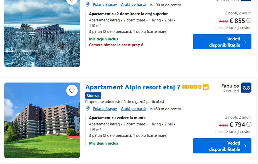 Prețurile diferă semnificativ în funcție de nivelul de lux ales. În Poiana Brașov, tarifele pornesc de la aproximativ 230 de euro pentru două nopți, însă pot ajunge rapid la 400 de euro sau mai mult, iar în unele cazuri speciale, pachetele premium depășesc această sumă. Gradul de ocupare este deja foarte ridicat, ajungând la aproximativ 85%, semn că cererea pentru această perioadă este una intensă, în ciuda costurilor.