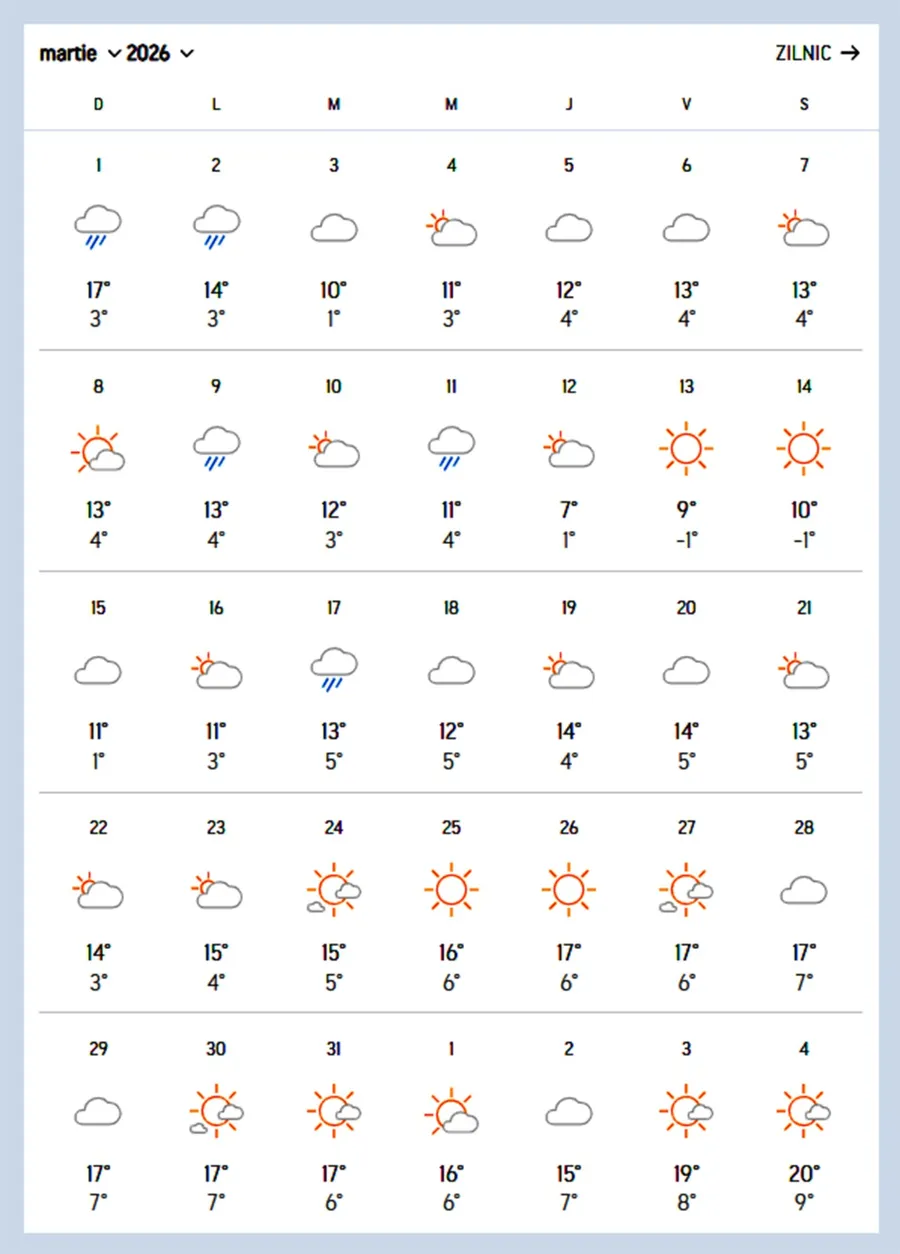 Tendința generală este de încălzire treptată, confirmată de valorile maxime prognozate spre finalul lunii, care ating frecvent 11–17 grade Celsius.