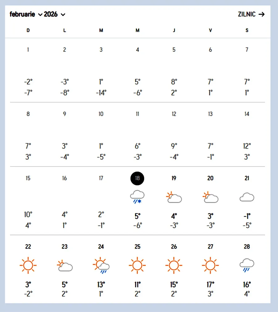 Conform prognozelor zilnice, perioada rămasă din februarie este caracterizată de temperaturi diurne oscilând în general între 3 și 17 grade Celsius, cu minime nocturne aflate frecvent peste pragul de îngheț sau doar ușor sub acesta. În prima jumătate a intervalului analizat apar condiții variabile, cu episoade de înnorări temporare și precipitații mixte izolate, însă fără acumulări de zăpadă. O scurtă perioadă cu lapoviță sau fulguieli sporadice este indicată în jurul datei de 18 februarie, însă contextul termic nu favorizează depunerea unui strat consistent.