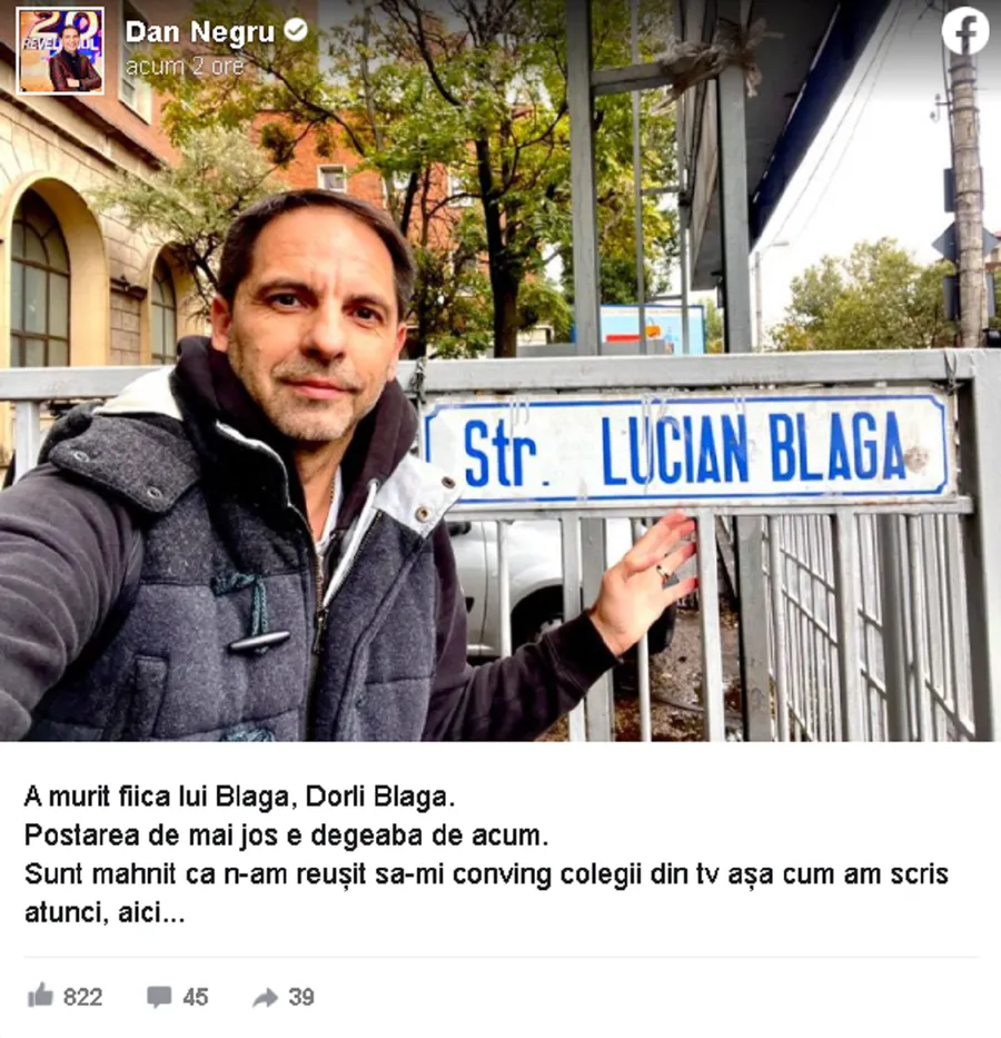 ”A murit fiica lui Blaga, Dorli Blaga. Postarea de mai jos e degeaba de acum. Sunt mahnit ca n-am reușit sa-mi conving colegii din tv așa cum am scris atunci, aici…”, a scris Dan Negru, miercuri, pe Facebook.