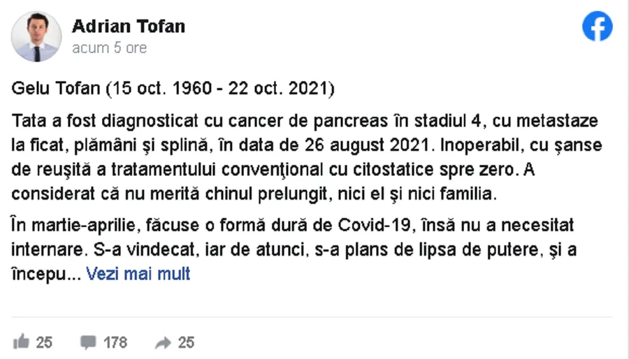 ”Tata a fost diagnosticat cu cancer de pancreas în stadiul 4, cu metastaze la ficat, plămâni şi splină, în data de 26 august 2021. Inoperabil, cu şanse de reuşită a tratamentului convenţional cu citostatice spre zero. A considerat că nu merită chinul prelungit, nici el şi nici familia.