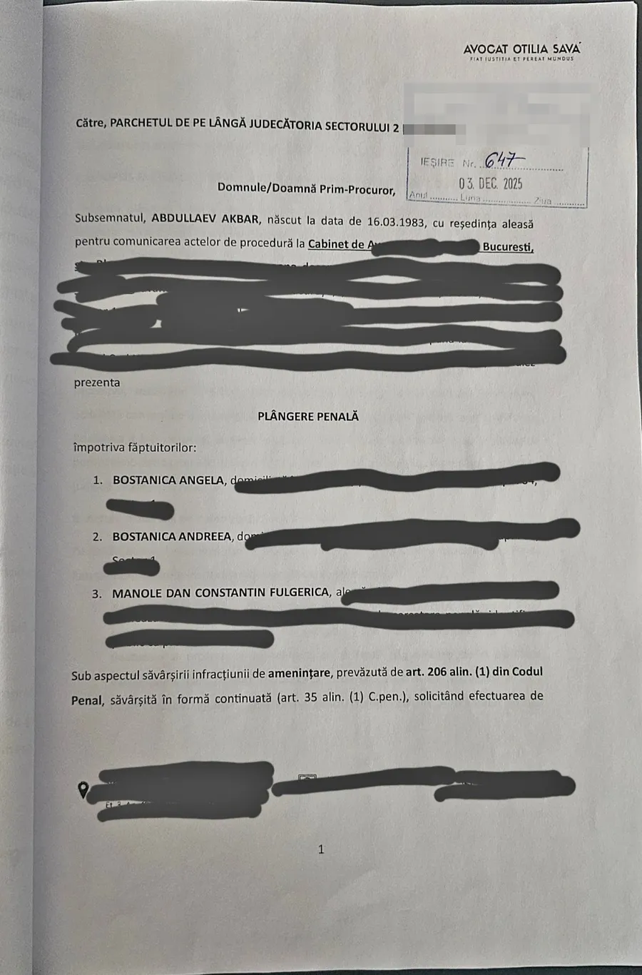 Plângerea penală pe care i-a făcut-o Abush Andreei Bostănică.