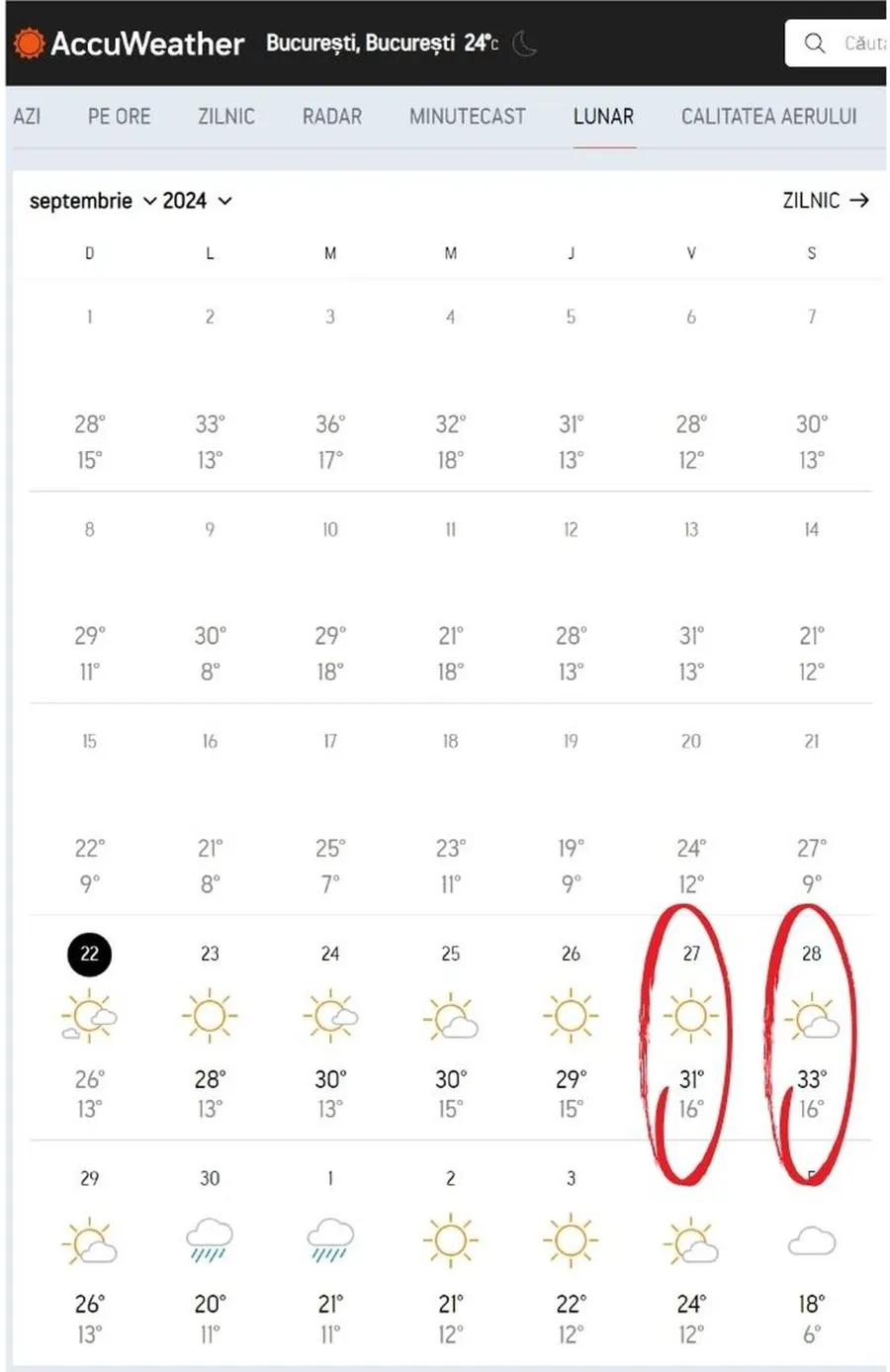 Meteorologii AccuWeather au actualizat prognoza meteo și anunță o încălzire accentuată a vremii. Săptămâna viitoare, termometrele vor indica până la 33 de grade, în sudul țării. Cel mai cald o să fie în zilele de 27 și 28 septembrie, atunci când românii se vor simți ca într-o zi de vară.