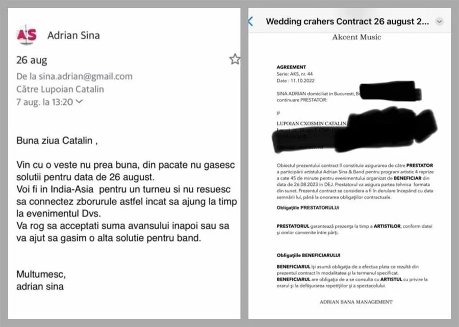 O mireasă din Cluj și-a revărsat furia în mediul online. În luna august a acestui an a avut nunta, iar încă din luna octombrie a anului 2022 a încheiat un contract cu Adrian Sînă. Acesta și-a luat angajamentul de a cânta la eveniment, a primit chiar și un avans considerabil, însă cu doar trei săptămâni înainte a anulat totul. Cântărețul a motivat gestul său spunând că are un turneu în Asia, însă a fost prins cu minciuna.