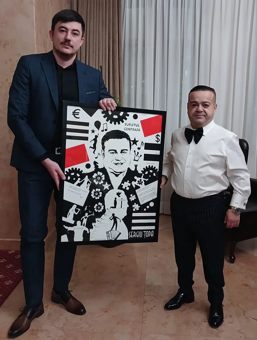 Mai exact, Sergiu Țopa, cunoscut pentru stilul său artistic, i-a oferit lui Adrian Minune un tablou personalizat, realizat cu multă atenție la detalii. Lucrarea surprinde un portret vibrant al manelistului, pictorul reușind să capteze perfect energia și personalitatea lui Adrian.