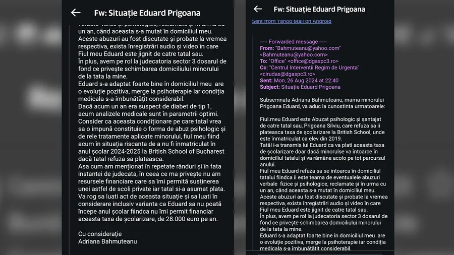 ”Fiul meu, Eduard, este abuzat psihologic și șantajat de către tatăl lui, Silviu Prigoană, care refuză să-i plătească taxa de școlarizare la British School, unde este înmatriculat din 2019. I-a transmis că va plăti taxa doar dacă se întoarce în domiciliul tatălui și va rămâne acolo pe tot parcusul anului.