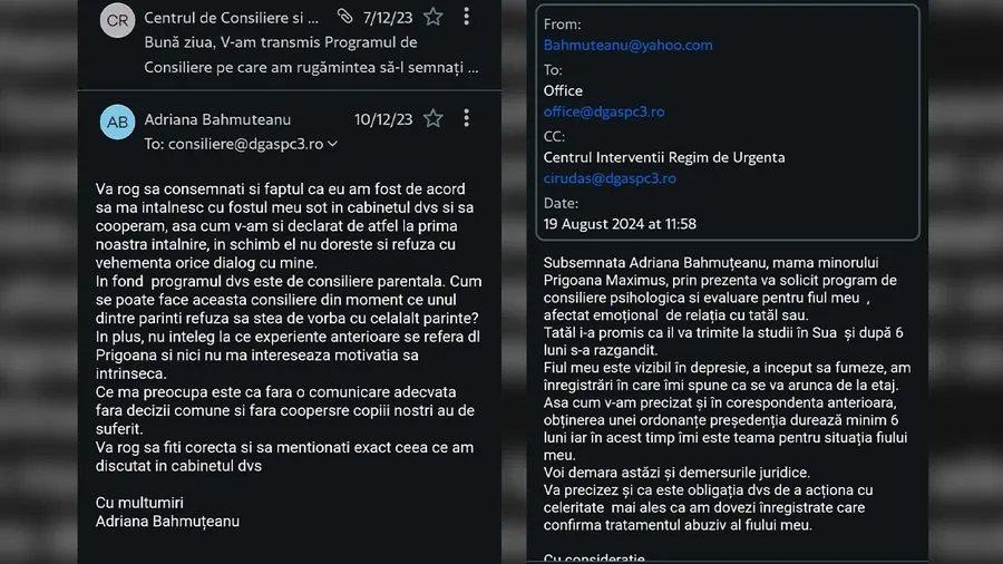 ”Vă solicit program de consiliere psihologică și evaluare pentru fiul meu, Maximus, afectat emoțional de relația cu tatăl său. Tatăl i-a promis că îl va trimite la studii în SUA și după șase luni s-a răzgândit. Fiul meu e, vizibil, în depresie, a început să fumeze, am înregistrări în care îmi spune că se va arunca de la etaj. Așa cum v-am precizat și în corespondența anterioară, obținerea unei ordonanțe președințiale durează minimum șase luni, iar în acest timp îmi este teamă pentru situația fiului meu.”