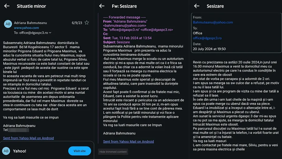 ”Astăzi, 20 iulie 2024, în jurul orei 16, Maximus a venit la domiciliul meu cu autoturismul electric pe care l-a condus în condițiile în care era extrem de obosit. Am stat de vorbă pe canapea și a adormit de două ori. I-am spus să meargă se se culge, dar a refuzat, pe motiv că nu-l lasă tatăl lui. I-am luat cheile de la mașină și i-am spus că poate merge cu Uberul, dacă vrea să plece. Eduard l-a mobilizat și a început o altercație între ei, i-am despărțit și Maximus a plecat cu Uberul. Pe parcursul discuției cu Maximus, tatăl lui l-a sunat de mai multe ori și l-a înjurat, i-a vorbit foarte urât și l-a amenințat cu bătaia. Vă rog să luați măsuri!”