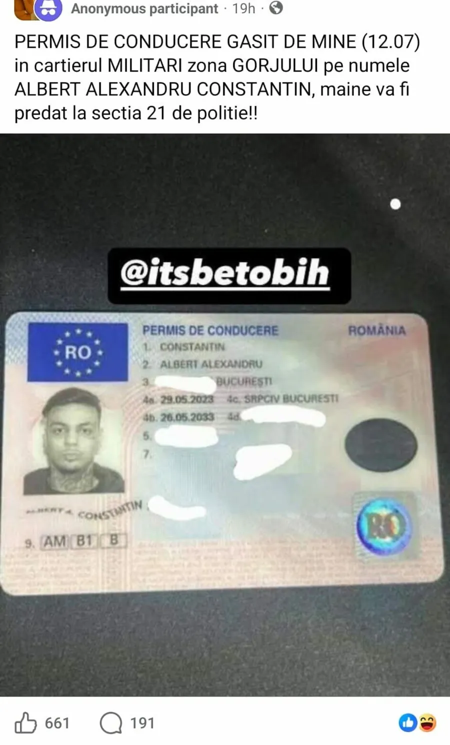”Permis de conducere găsit de mine (07.12) în cartierul Militari, zona Gorjului, pe numele Albert Alexandru Constantin. Mâine va fi predat la secția 21 de Poliție”, a scris utilizatorul anonim.
