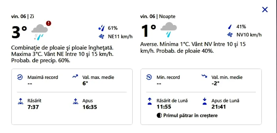 Doar că, ce să vezi? Meteorologii de la Weather.com au emis o avertizare meteo și au transmis că în cursul zilei de mâine va fi o ploaie înghețată, „freezing rain”. Se va forma și polei, așa că șoferii sunt sfătuiți să aibă mare grijă. Vântul va bate ușor, cu 11 km/oră, iar probabilitatea de precipitații va fi de 61% pe timpul zilei. Noaptea, lucrurile se schimbă. Temperaturile scad, iar mercurul în termometre nu va arăta mai mult de 1 grad Celsius. Vântul va bate cu 10 km/oră, iar probabilitatea de precipitații va fi de 40%.
