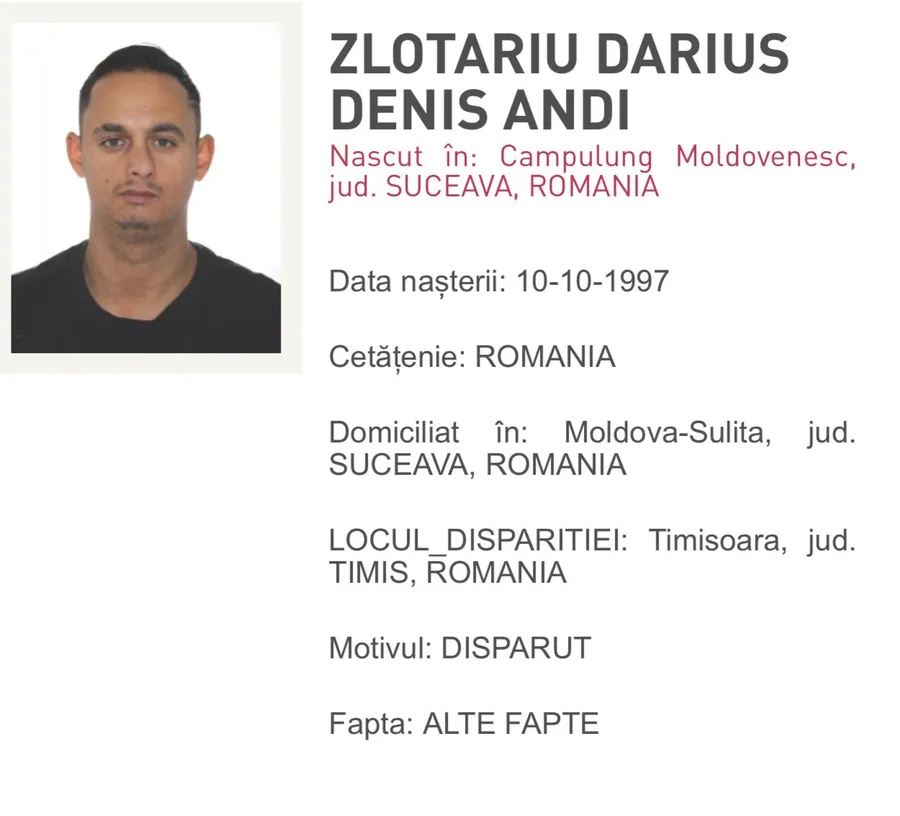 „Numitul Zlotariu Darius-Denis-Andi, în vârstă de 27 de ani, a plecat voluntar de la domiciliu în urmă cu două luni de zile, nu a mai luat legătura cu familia și nu s-a întors acasă până în prezent. Semnalmente: înălțime 1,65 m, greutate 70 kg, brunet, ochi caprui, față ovală. Îmbrăcăminte: Trening de culoare gri, încălțăminte de culoare albă”, a transmis Poliția Română.