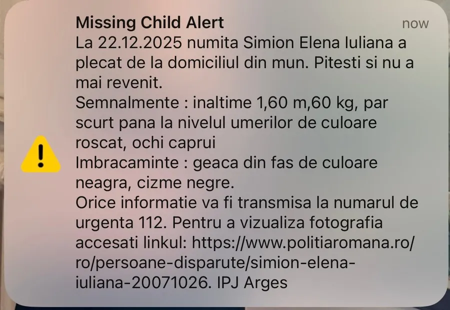 Autoritățile din Pitești au emis o alertă privind dispariția Elenei Iuliana Simion, dispărută de la domiciliul său în data de 22 decembrie 2025. Pentru găsirea fetei, a fost transmisă o alertă prin sistemul Ro-Alert în întreg județul Argeș, iar autoritățile solicită sprijinul publicului pentru a furniza orice informație utilă.