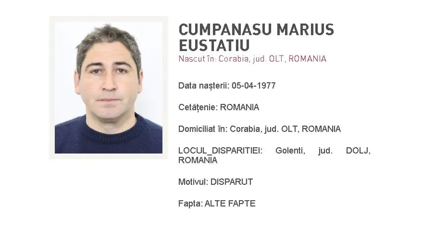 Oamenii legii au fost sesizați cu privire la dispariția lui Cumpănașu Marius Eustatiu, în vârstă de 48 de ani, domiciliat în Corabia, județul Dolj. Bărbatul nu a mai putut fi contactat de către fratele său încă din 2015.