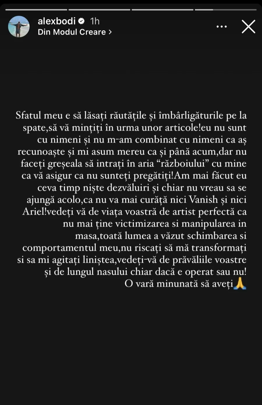 Am mai făcut eu ceva timp niște dezvăluiri și chiar nu vreau să se ajungă acolo. Vedeți-vă de viața voastră de artist perfectă, că nu mai ține victimizarea și manipularea în masă, toată lumea a văzut schimbarea și comportamentul meu, nu riscați să mă transformați și să-mi agitați liniștea. Vedeți-vă de prăvăliile voastre și de lungul nasului, chiar dacă e operat sau nu! O vară minunată să aveți”, este mesajul notat de Alex Bodi la secțiunea Instastory.