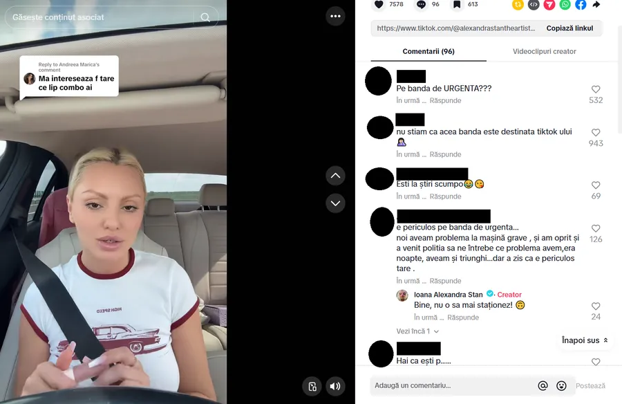 „Nu știam că acea bandă este destinată TikTok-ului”/ „E periculos pe banda de urgență. Noi aveam probleme la mașină grave și am oprit și a venit politia să ne întrebe ce problemă avem, era noapte, aveam și triunghi… dar a zis ca e periculos tare”/ „Cât este amenda?”, „Te admir și îmi place maxim de tine, dar am o întrebare: cu cine ai făcut școala de șoferi?”, au fost câteva dintre comentarii.
