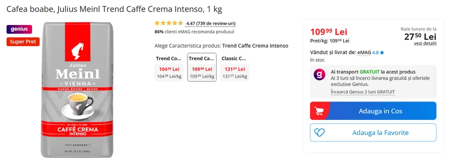 Unul dintre produsele preferate de consumatori, mai exact cafeaua boabe „Julius Meinl Trend Caffè Crema Intenso”, în ambalaj de 1 kg și-a văzut prețul urcând semnificativ în 2025, ajungând la 109,99 lei pe eMAG. Această creștere abruptă a surprins mulți iubitori de cafea, mulți dintre ei obișnuiți cu un cost mult mai accesibil pentru același produs.