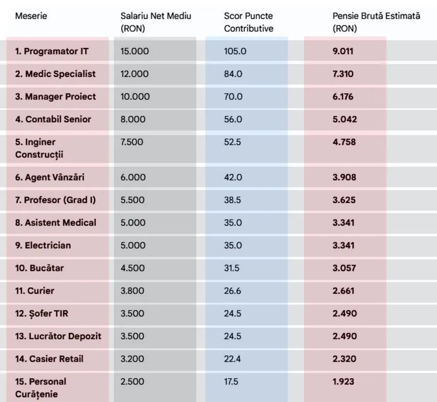 Programatorii IT se află în fruntea clasamentului, cu o pensie brută estimată de 9.011 RON, rezultat al unui salariu mediu net de 15.000 RON și al unui punctaj contributiv ridicat. Urmează medicii specialiști, care ajung la 7.310 RON, și managerii de proiect, cu o pensie estimată la 6.176 RON.