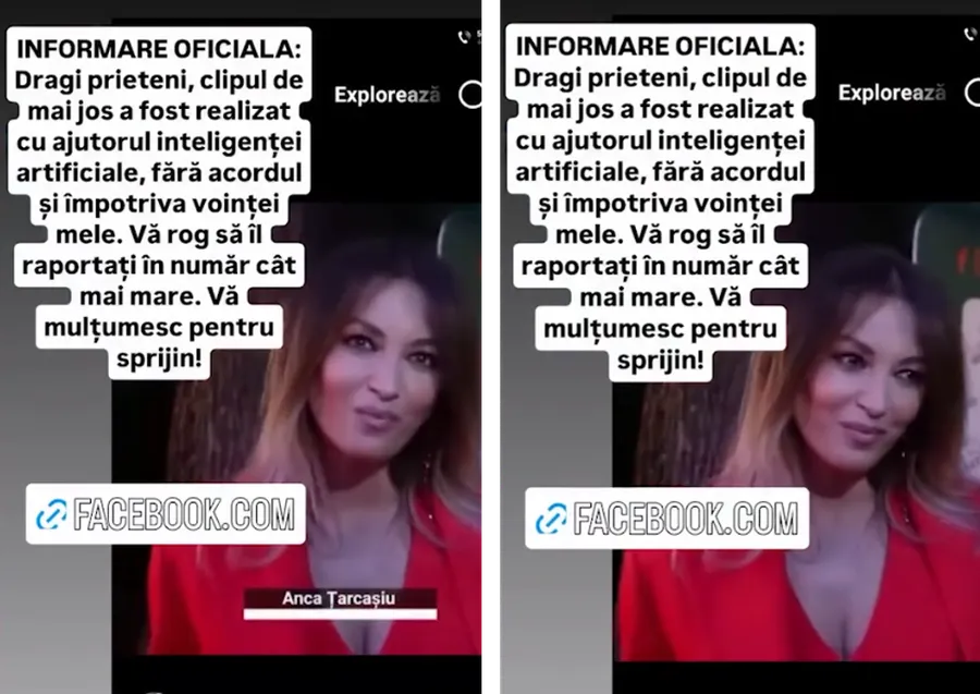 „Dragi prieteni, clipul de mai jos a fost realizat cu ajutorul inteligenței artificiale, fără acordul meu și împotriva voinței mele. Vă rog să îl raportați în număr cât mai mare. Vă mulțumesc pentru sprijin!”, a scris Anca Țurcașiu pe Instagram, alături de filmulețul fake.