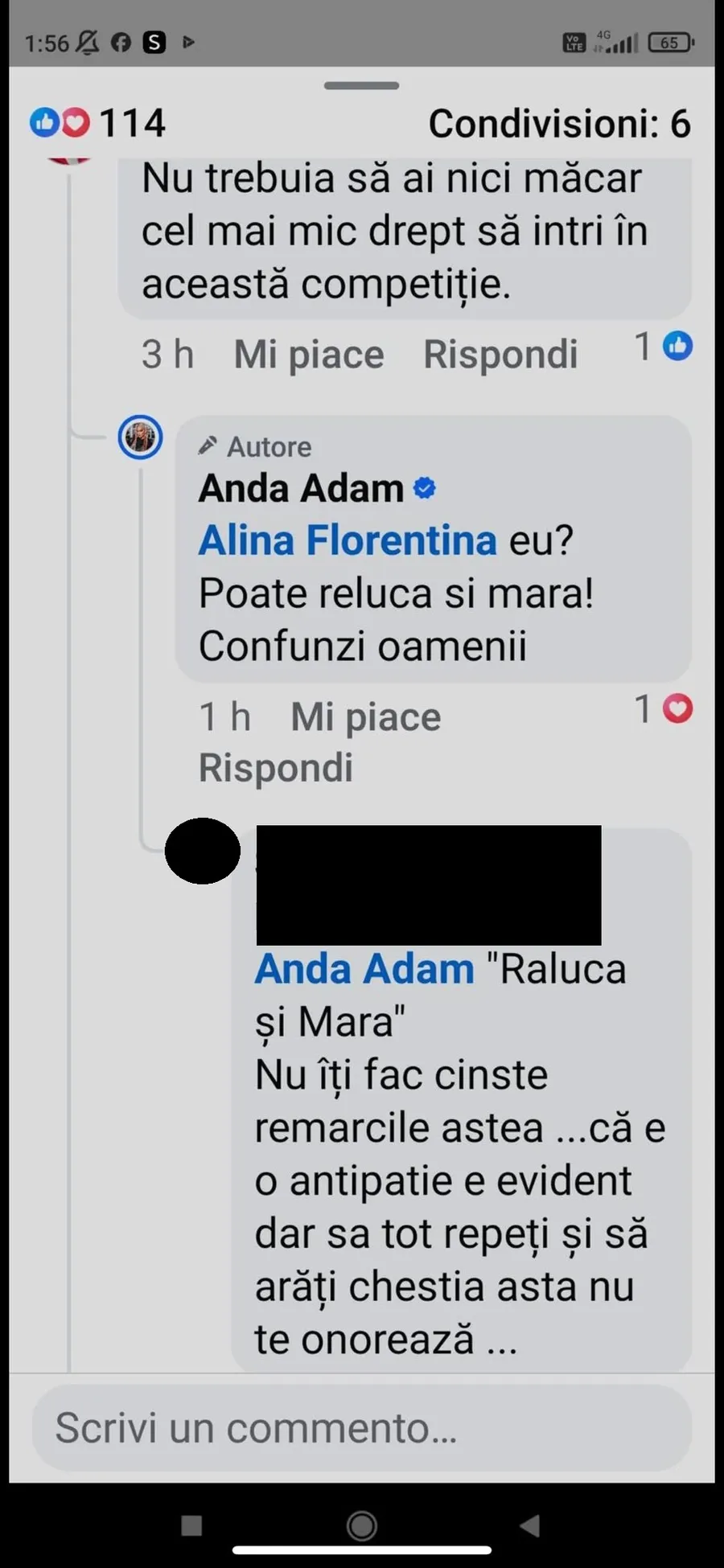 Recent, o femeie i-a scris la una dintre postările sale de pe Facebook: „Nu trebuia să ai nici măcar cel mai mic drept să intri în această competiție”. Anda Adam a reacționat imediat cu o replică acidă, atacând-o atât pe Mara, cât și pe Raluca Bădulescu.