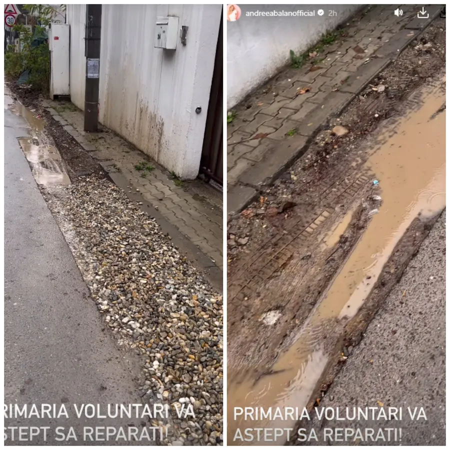 „Au executat lucrări de săpătură pentru branșamentul electric. Adică pentru acea clădire, acolo, lângă casa mea. Și au spart, au spart în fața casei mele. Uitați ce e aici. Așa că, Primăria Voluntari, vă rog frumos să veniți să reparați această mizerie din fața casei mele. Mai aveți până pe 14 noiembrie. Așa scrie acolo. Dacă nu reparați, mă prezint personal la primărie și voi face reclamație”, a spus Andreea Bălan, în mediul online.