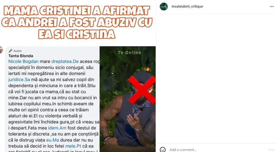 Nu este prima oară când mama Cristinei Rotaru își expune opinia în spațiul public. Andrei a fost dur criticat de soacra lui, după imaginile difuzate la Insula Iubirii cu actele de infidelitate ale ginerelui său. În plus, femeia a suferit mult atunci când și-a făcut fiica plângând.