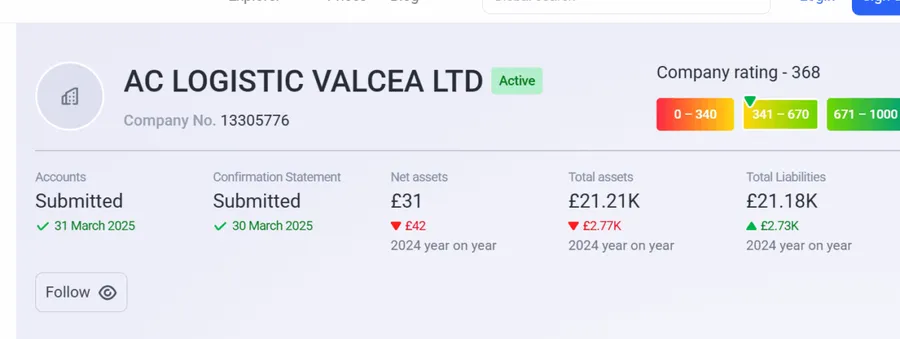 Dar povestea nu se oprește aici. Se pare că Andrei se confruntă și cu probleme financiare serioase. Firma pe care o deține, AC LOGISTIC VALCEA LTD, activă în Regatul Unit și specializată în transport rutier de mărfuri, cu sediul în Grays, Anglia, se află într-o situație delicată: pentru anul încheiat la 31 martie 2025, compania avea datorii de 21.180 lire, în timp ce activele nete erau de doar 31 lire.