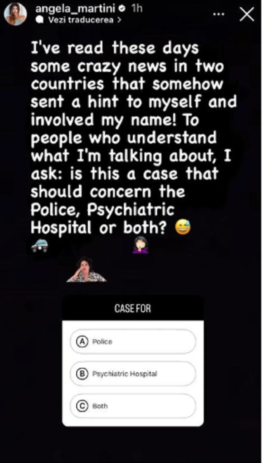 ”Am citit zilele acestea câteva știri incredibile, în două țări, care, cumva, făceau referire la numele meu. (nr. jaful în care Mădăline Ghenea a fost implicată). Pentru oamenii care înțeleg la ce mă refer, întreb: Acesta este un caz în care să implic poliția, spitalul psihiatric sau amândouă?”, este mesajul Angelei Martini de pe Instagram.