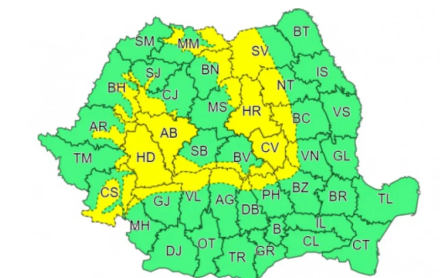 Iată harta transmisă de către ANM cu județele din România care vor fi sub cod galben: