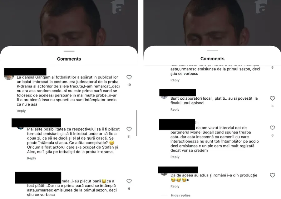 „Mai este posibilitatea ca respectivului sa îi fi plăcut formatul emisiunii și să fi întrebat unde or să fie a doua zi, ca să se ducă și el al de gură cască. Se poate întâmpla și asta. Ce atâta conspirație? 😁 Oricum a fost actorul care s-a ocupat de Stefan și Alex, nu îi știa pe fotbaliști de la proba k-drama.”, a spus altcineva.