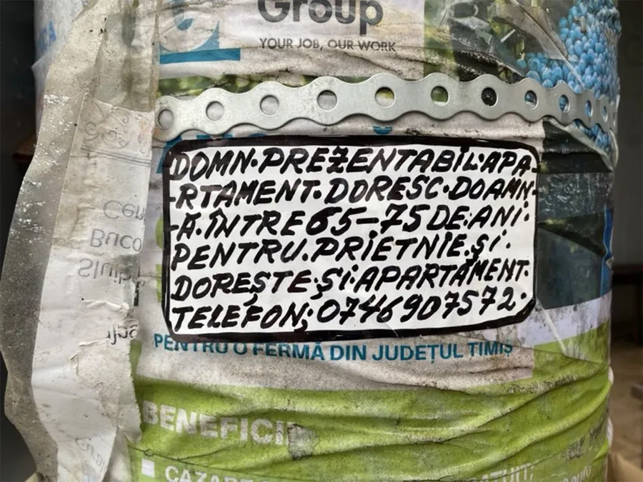 „Domn prezentabil, apartament, doresc doamnă între 65 – 75 de ani pentru prietenie și dorește apartament”, se arată în afișul lipit pe un stâlp de către un bărbat.
