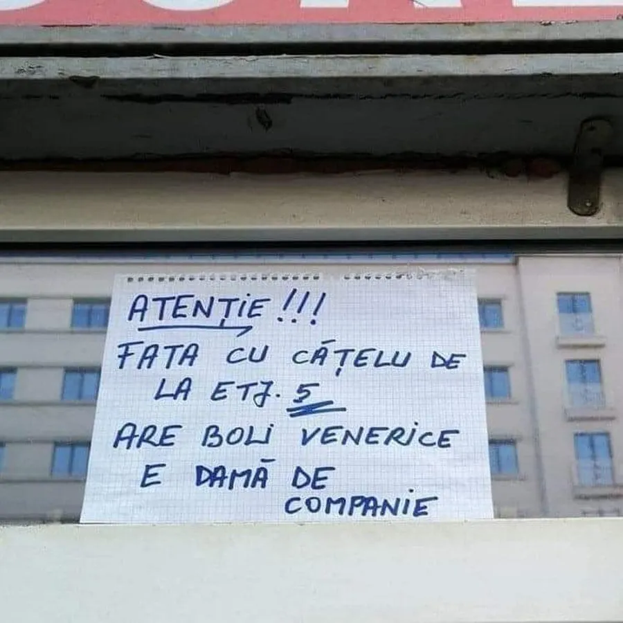 Mulți oameni au încremenit atunci când au ieșit din imobilul unde locuiesc și au văzut o hârtie cu un mesaj jignitor la adresa unei vecine de la etajul 5. Se pare că cineva din blocul respectiv a vrut să facă o glumă sau nu, care a stârnit atât amuzament, cât și revoltă. Un locuitor a luat o foaie de hârtie, pe care a scris un text scurt legat de o fată cu un câine, care ar fi damă de companie. Afișul a fost, de fapt, un avertisment la adresa tuturor vecinilor, care o văd pe tânăra respectivă. Deși poate inițial a părut amuzant pentru unele persoane, ulterior anunțul a stârnit multă revoltă printre internauți și vecini.
