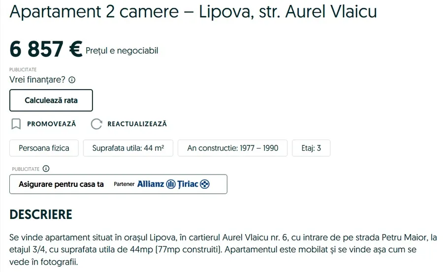 Locuința, situată în orașul Lipova, județul Arad, poate fi achiziționată pentru doar 7.000 de euro, un preț rar întâlnit pe piața imobiliară actuală.