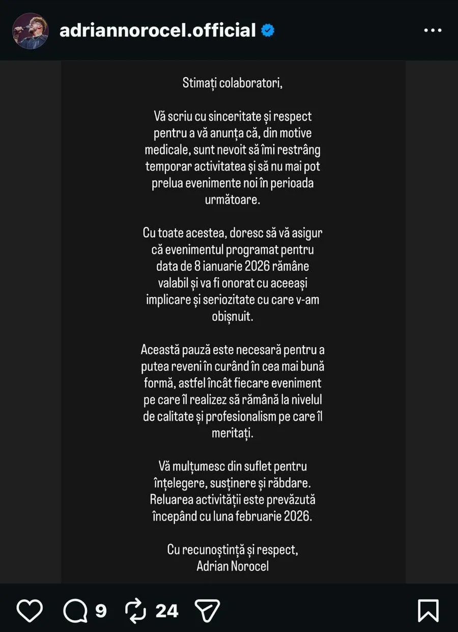 Artistul a fost nevoit să ia această hotărâre din motive medicale, care impun o perioadă de repaus și limitarea activităților solicitante. În acest context, Adrian Norocel nu va mai putea prelua evenimente noi în perioada următoare, alegând să se concentreze pe refacere și pe menținerea unei stări de sănătate care să îi permită revenirea în condiții optime.