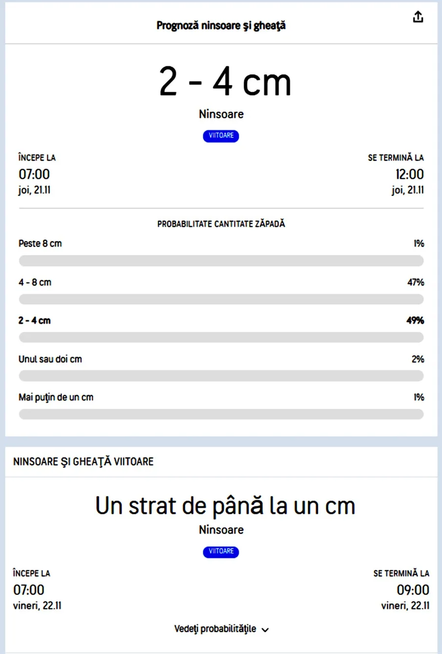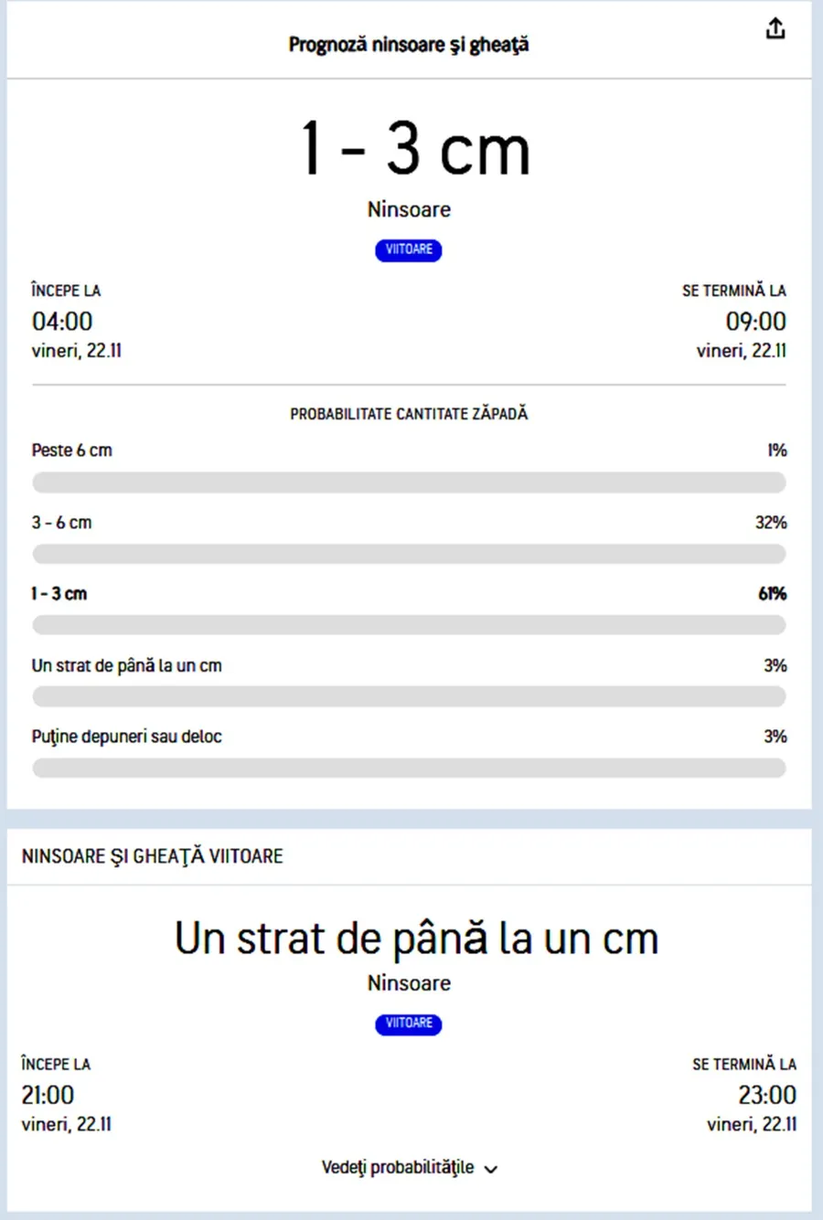Fulgii de nea vor începe să cadă de vineri. 22 noiembrie, de la ora 4:00 și se vor opri în jurul orei 9:00. Potrivit specialiștilor Accuweather, stratul de zăpadă format va fi de 1-3 centimetri. De asemenea, ninsoarea își va face apariția și pe timpul serii, în intervalul orar 21:00 – 23:00, formându-se un strat de zăpadă de până la un centimetru.