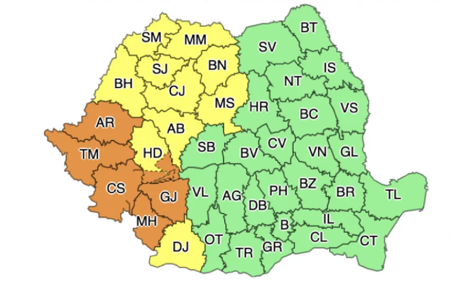 Începând din această duminică, ora 15:00, până luni la ora 03:00, ANM a emis un cod galben pentru următoarele județe: