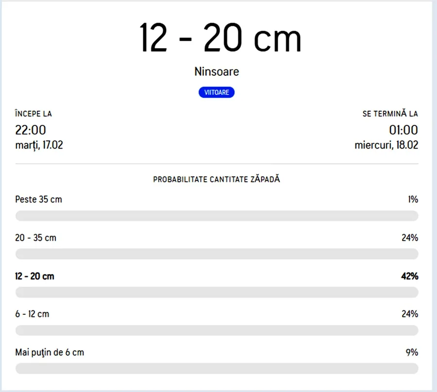 În intervalul menționat se anunță ninsori abundente. În doar 3 ore, va ninge ca pe vremuri. Se anunță strat de zăpadă de 20 cm în București, existând probabilitate de 24% să se ajungă la 35 cm.