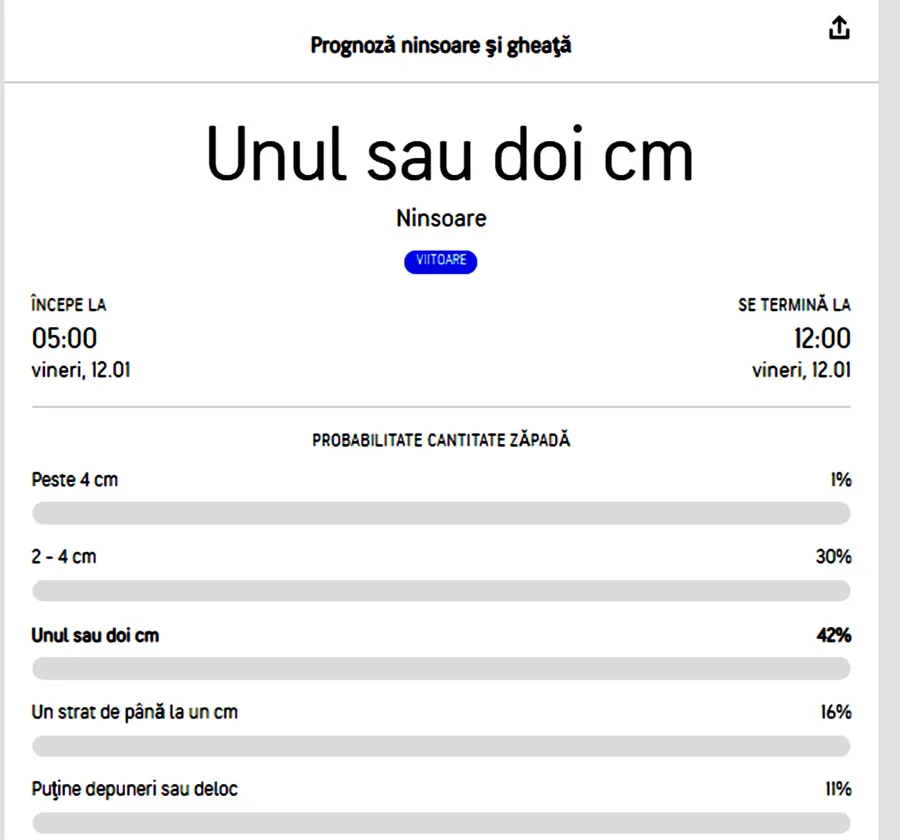 Bucureștenii au parte de zăpadă în această dimineață. A început să ningă începând cu ora 5:00 dimineața, iar specialiștii Accuweather preconizează că fulgii de zăpadă vor dispărea în jurul orei 12:00. Este de ajuns, însă, să se depună un strat de zăpadă de 1 sau 2 centimetri. Mercurul din termometre continuă să arate grade numai cu minus. Există posibilitatea să se formeze și un fenomen meteo periculos atât pentru șoferi, cât și pentru conducătorii auto: ghețușul! Maxima acestei zile va fi de 1 grad Celsius în Capitală. Vântul va bate cu circa 15 km/oră și se anunță ninsoare sporadică, fiind emisă avertizare „wintercast”. La noapte, meteorologii anunță -7 grade.