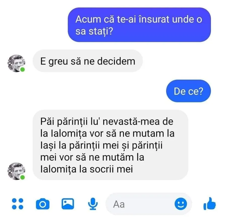 -Păi părinții nevestei mele de la Ialomița vor să ne mutăm la Iași, la părinții mei și părinții mei vor să ne mutăm la Ialomița, la socrii mei.