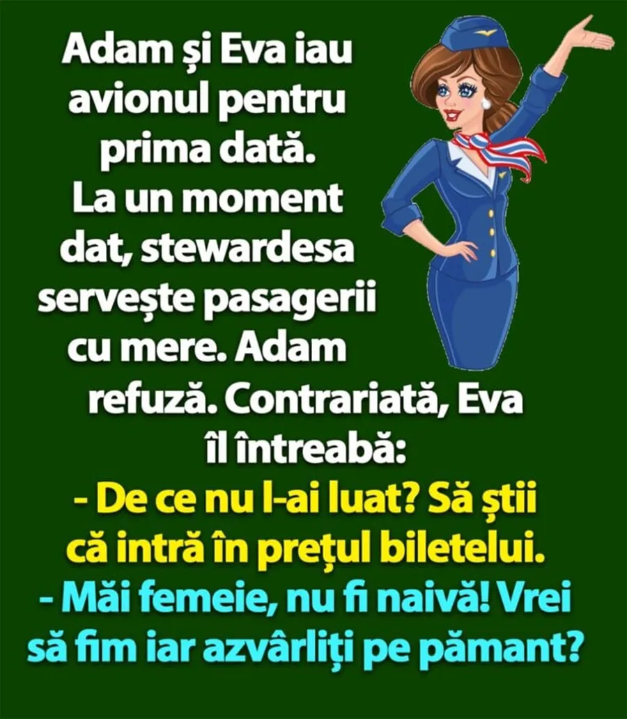 Dragi cititori, CANCAN.RO vă prezintă un banc fabulos în acest sfârșit de săptămână. Personajele principale sunt Adam și Eva, care fac prima lor călătorie cu avionul. Un măr îi pune în dificultate, iar acolo începe un schimb de replici amuzant. Spor la citit!