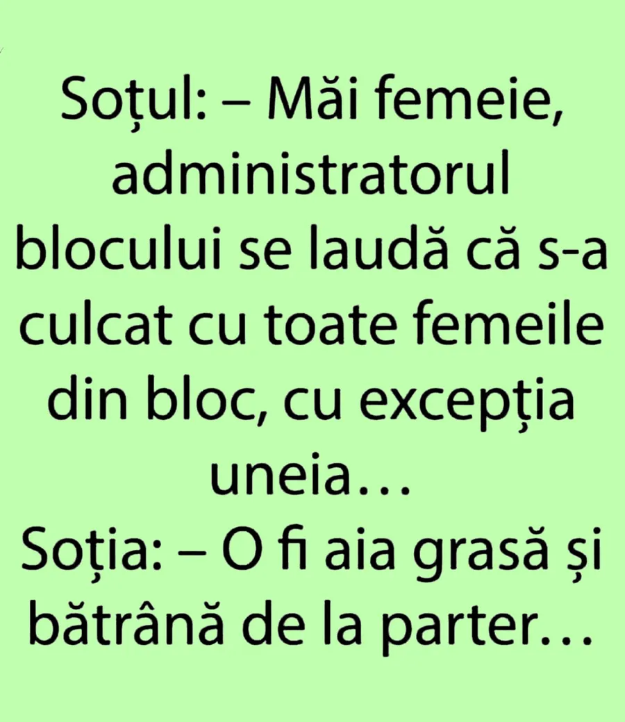 Soțul: – Măi femeie, administratorul blocului se laudă că s-a culcat cu toate femeile din bloc, cu excepția uneia…