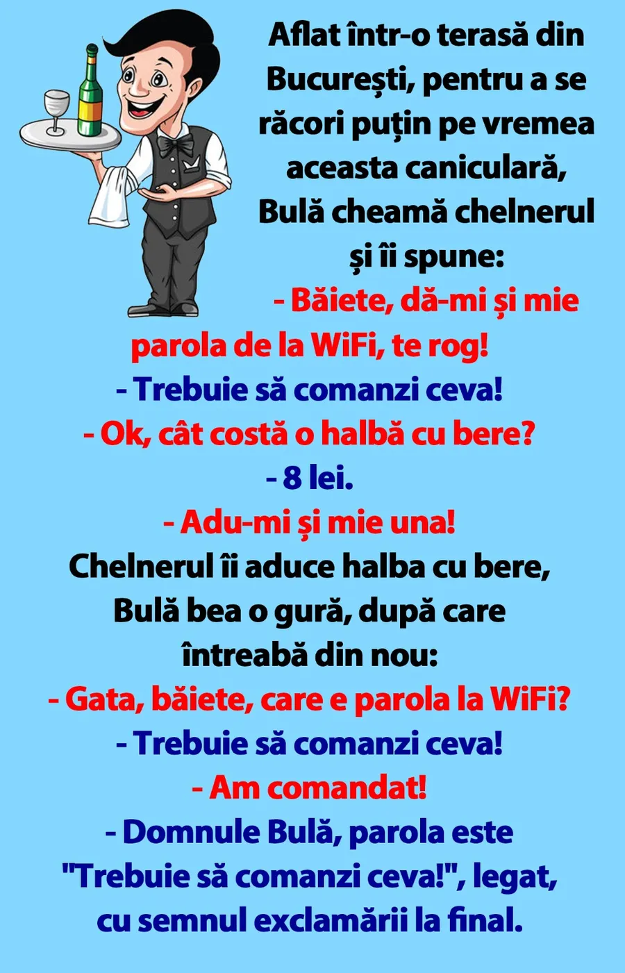 Aflat într-o terasă din București, pentru a se răcori puțin pe vremea aceasta caniculară, Bulă cheamă chelnerul și îi spune: