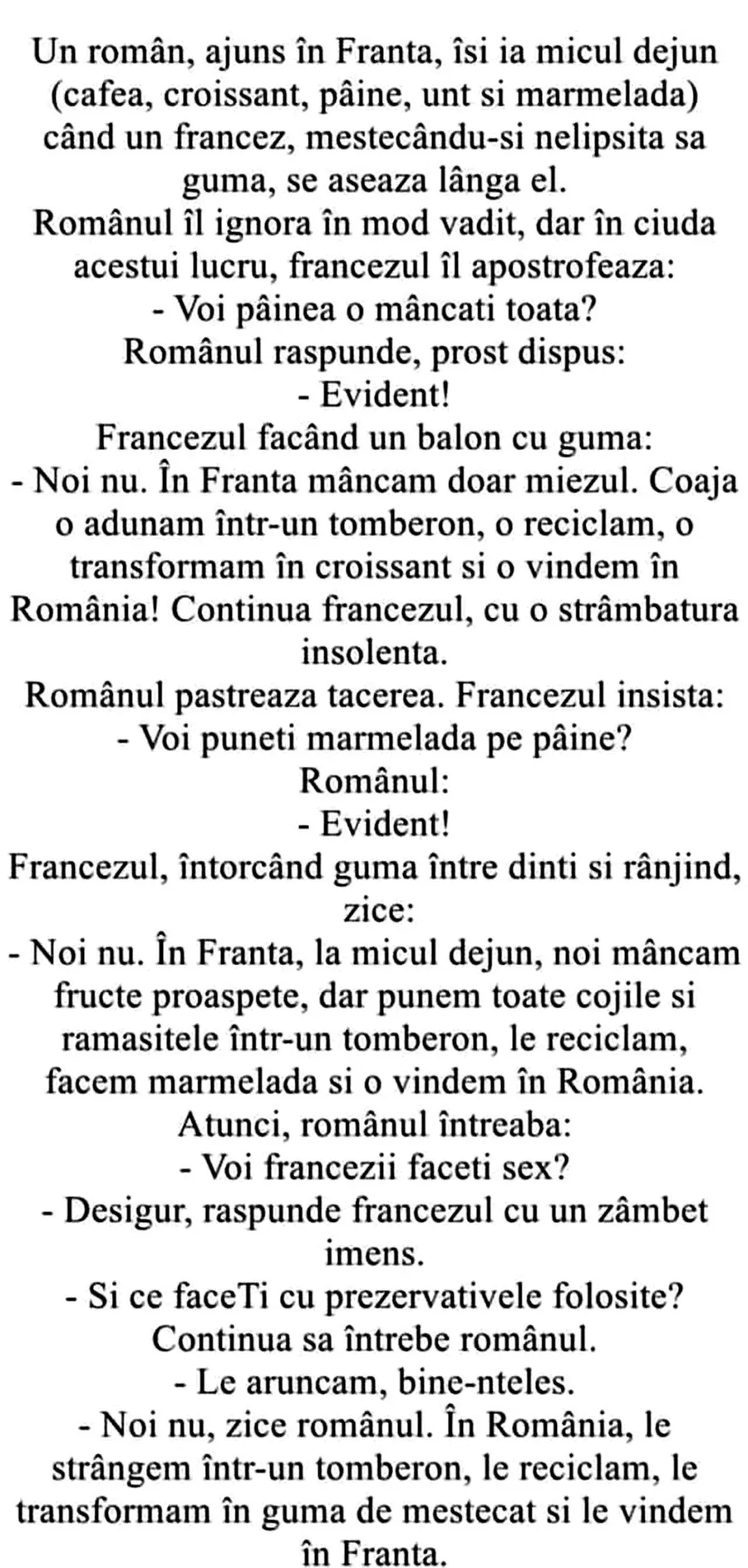 „Un român, ajuns în Franta, îsi ia micul dejun (cafea, croissant, pâine, unt si marmelada) când un francez, mestecându-si nelipsita sa gumă, se așează lângă el. Românul îl ignora în mod vădit, dar în ciuda acestui lucru, francezul îl apostrofează:
