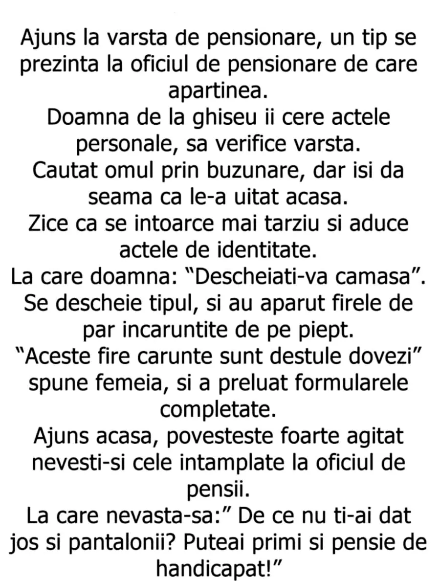 Ajuns la vârsta de pensionare, un tip se prezintă la oficiul de pensionare de care aparține. Doamna de la ghișeu îi cere actele personale, să verifice vârsta. Caută omul prin buzunare, dar își dă seama că le-a uitat acasă. Zice că se întoarce mai târziu și aduce actele de identitate. La care doamna: