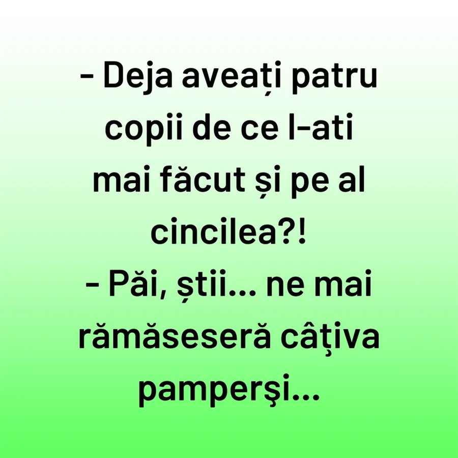 Dragă cititorule, CANCAN.RO îți aduce zâmbetul pe buze cu un banc tare haios. Doi părinți sunt întrebați de ce au luat decizia de a mai face al cincilea copil. Răspunsul lor a provocat hohote de râs.