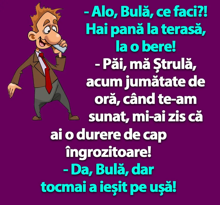 – Păi, mă Ștrulă, acum jumătate de oră, când te-am sunat, mi-ai zis că ai o durere de cap îngrozitoare!