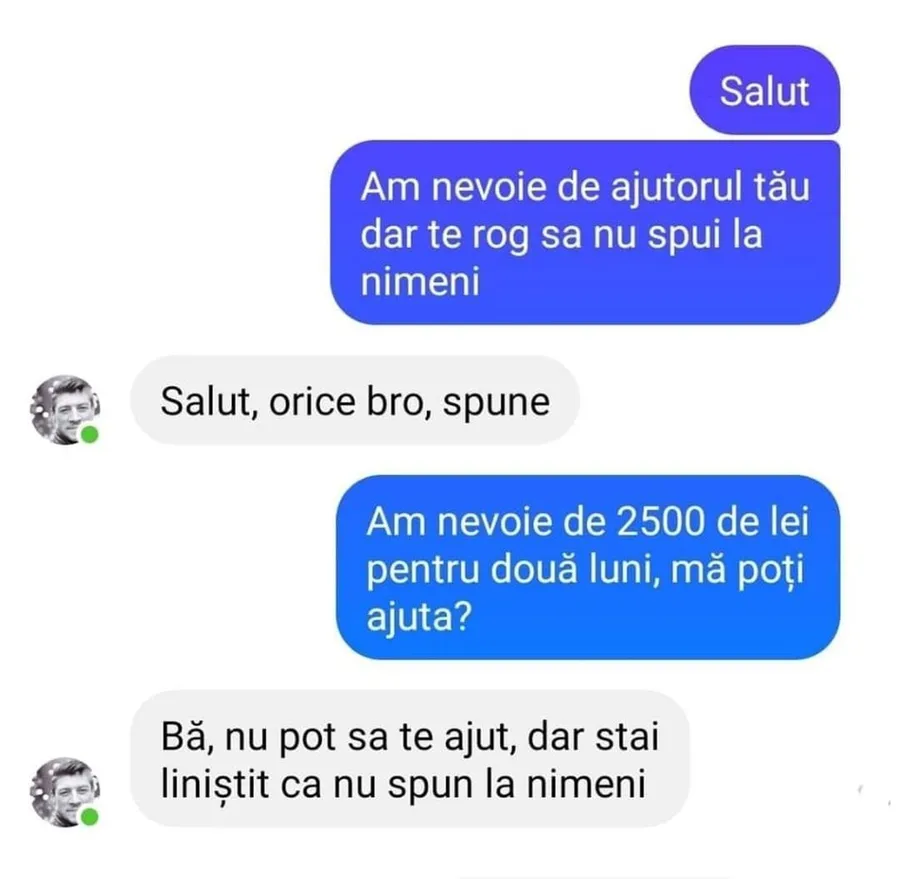 – Bă, nu pot să te ajut, dar stai liniștit că nu spun la nimeni.