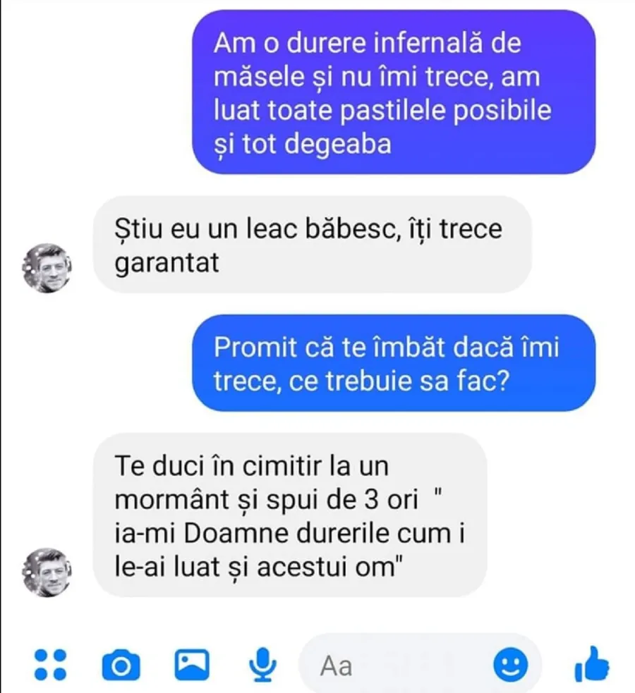 -Te duci în cimitir la un mormânt și spui de 3 ori ”ia-mi Doamne durerile cum i le-ai luat și acestui om”.