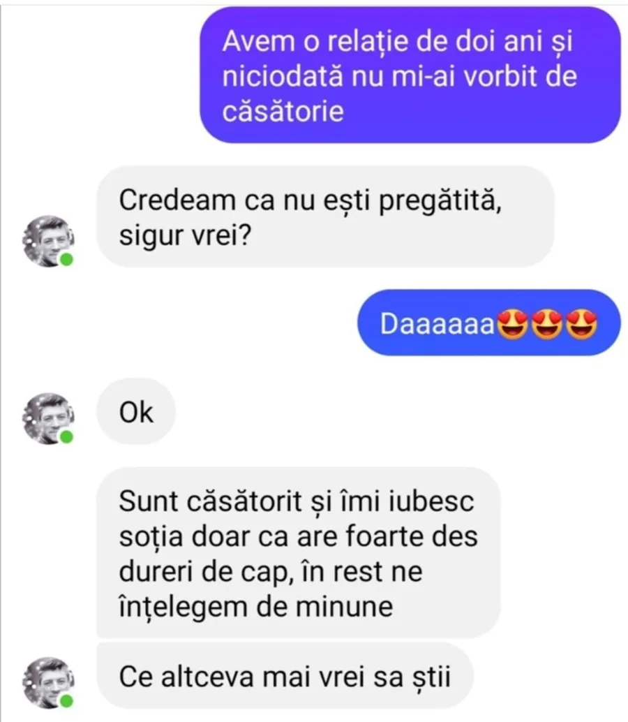 -Ok. Sunt căsătorit și îmi iubesc soția, doar că are foarte des dureri de cap, în rest ne înțelegem de minune. Ce altceva mai vrei să știi?