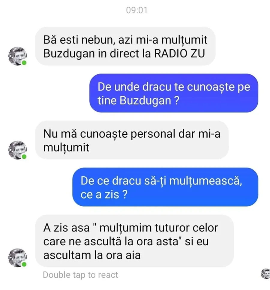 Banc. Vă aducem zâmbetul pe buze, în această seară, cu o serie de bancuri. Un tip vorbește pe Messenger cu un prieten și îi spune, bucuros fiind, că Buzdugan i-a mulțumit, în direct, la Radio ZU. Dialogul stârnește amuzamentul!