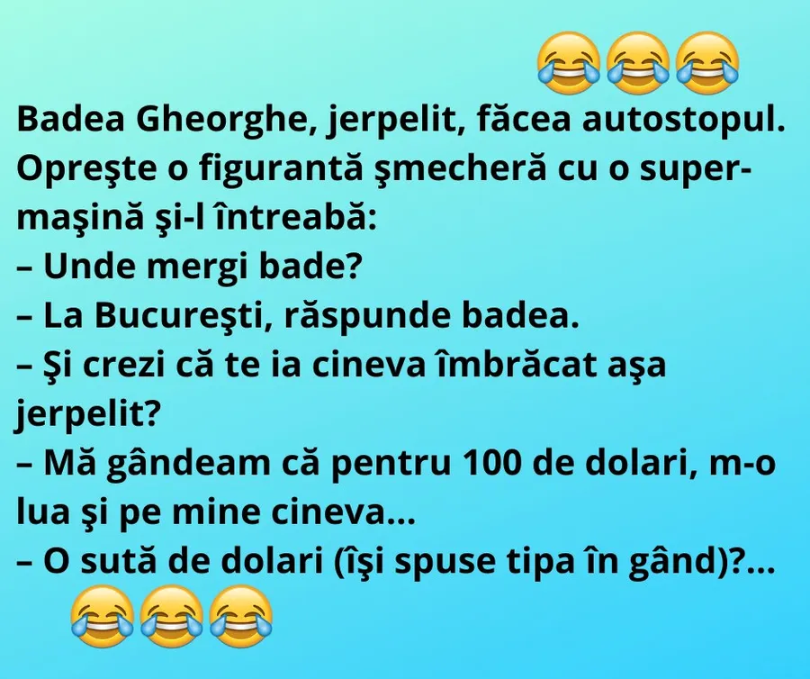 Ziua bună se cunoaște încă de dimineață, așa că trebuie începută cu zâmbetul pe buze. Așa că am pregătit un banc care cu siguranță o să te amuze copios. Protagonistul de astăzi este badea Gheorghe, care face autostopul. Deznodământul este hilar.